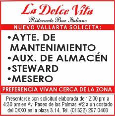 Área de Nuevo Vallarta, solicitamos ayudante de mantenimiento, aux. de almacén, steward, mesero. Presentar solicitud elaborada. Inf. 322 29 704-03.+