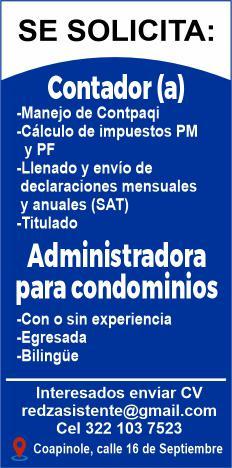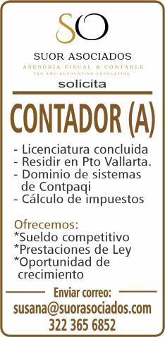 Solicita contador (a), licenciatura concluida y vivir en Puerto Vallarta. Llamar al tel. 331 06 360-65.+