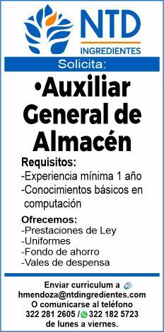 Empresa líder solicita auxiliar de almacén, encargado de limpieza entrega viviendas y enfermeros. Interesados llamar al tel. 322 19 439-17.+