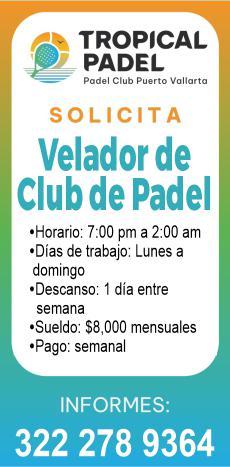 Club de padel solicita Velador, sueldo $8 mil mensuales. Tel. 322 27 893-64.+