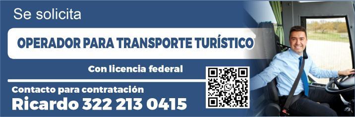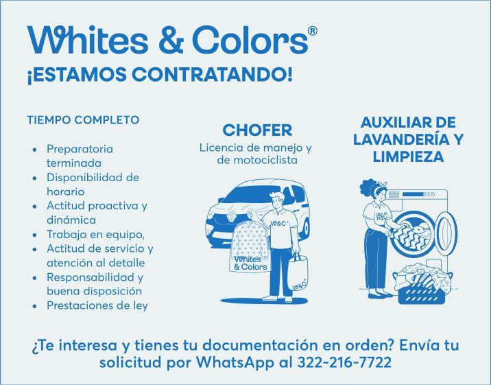 Solicitamos chofer con licencia de manejo y motociclista, auxiliar de lavandería y limpieza. Envía solicitud por WhatsApp tel. 322 21 677-22.+