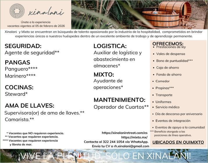 Buscamos para área Quimixto el siguiente personal: Agente de Seguridad, Panguero, Marinero, Steward, Operador de Cuartos, Camarista, contacta vía WhatsApp al. 322 24 41054.+