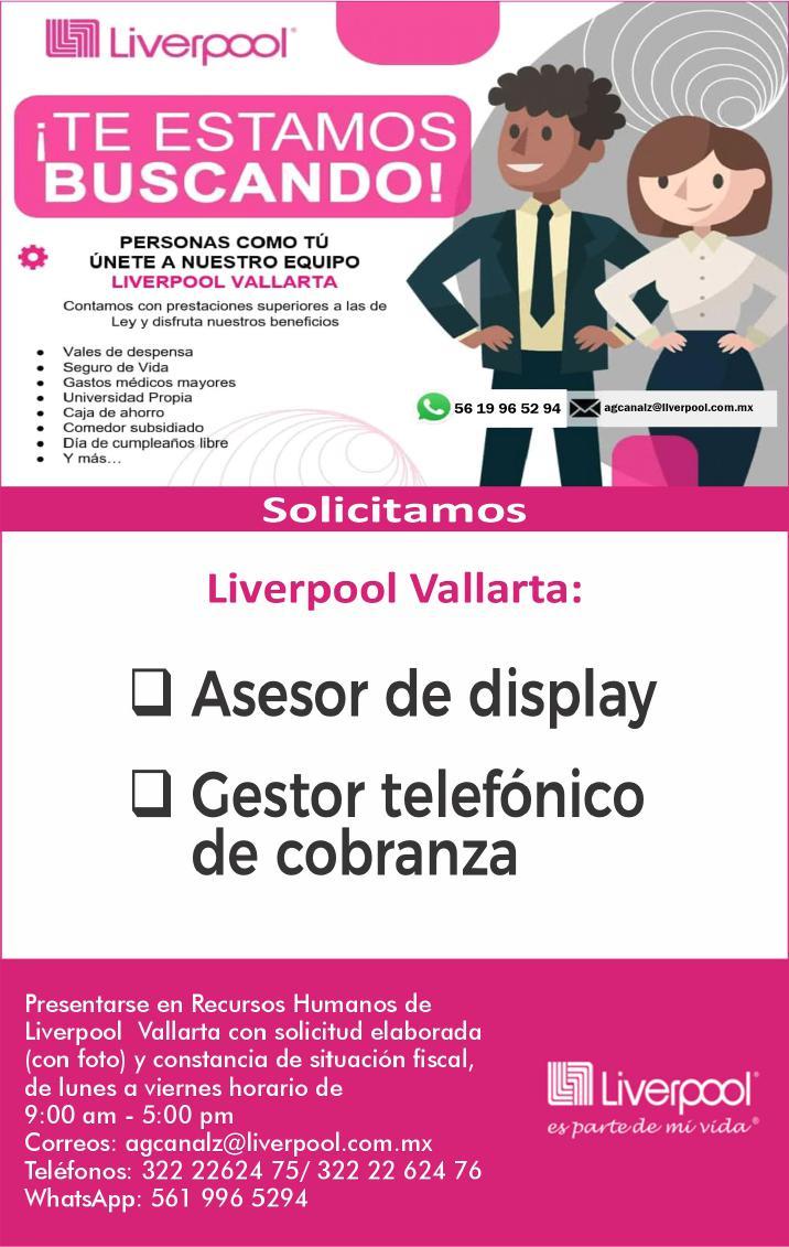 Solicitamos: asesor display, gestor telefónico de cobranza. Tel. 322 22 624-75, 322 22 624-76.+