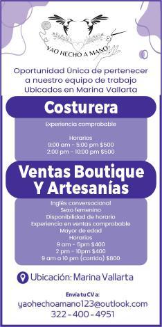 101-12.* Trabajo en Marina Vallarta, solicitamos costurera con experiencia comprobable. Informes. 322 40 049-51.+