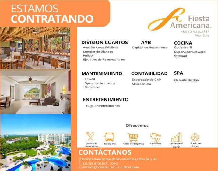 Solicitamos ayudante de cocina, jardinero/machetero, auxiliar de limpieza, recepcionista. Ofrecemos apoyo de transporte, salario quincenal, alimentos, uniformes. Inf. 331 00 834-13.+