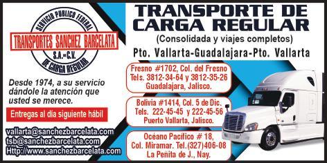 Paquetería, mensajería y carga regular, en 24 horas, Puerto Vallarta-Guadalajara. Inf. 322 22 245-45, 322 22 245-56.+