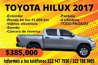 Hilux, mod. 2018, 4x4, 85,000 km, único dueño. $495,000. Inf. 322 14 528-14.+