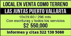 Col. Las Juntas, 10x29.60/296 mts., local en venta como terreno, con escrituras, todos los servicios. $2’550,000. Inf. y citas. 322 13 050-60.+