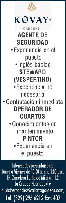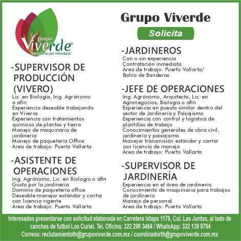 Solicitamos, jardinero/machetero, experiencia, manejo de podadora, $10,400 mensuales. Área de Bucerías. Ofrecemos transporte, salario quincenal, alimentos, uniformes. Inf. 331 00 834-13.+