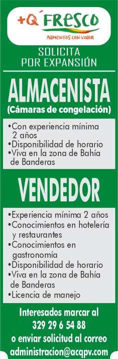 de congelación), experiencia mínima 2 años, vivir en la zona Bahía de Banderas. Inf. 329 29 654-88.+