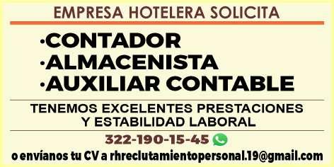 Se solicita contadora, zona de trabajo col. Aralias, Pto. Vallarta, licenciatura terminada, experiencia en el área de 3 a 5