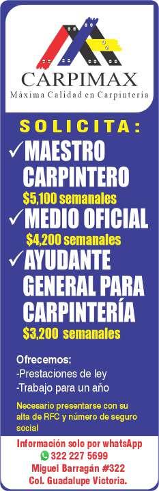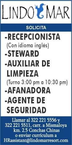 Se solicita ayudante de mantenimiento, mínimo 20 años, disponibilidad de horario, experiencia 1 año, manejo de máquinas y herramientas, conocimientos básicos de albañilería, electricidad, carpintería. Inf. 322 22 115-25, ext . 1-03.+