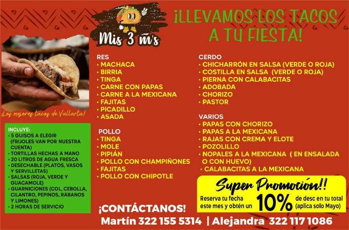 ¿Tienes una fiesta o evento? Nosotros te llevamos los tacos. Varios guisos a elegir, presupuesto sin compromiso. Inf. 322 11 710-86, 322 15 553-14.+