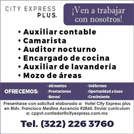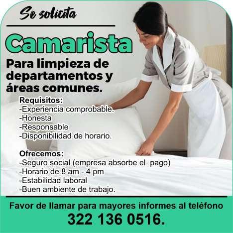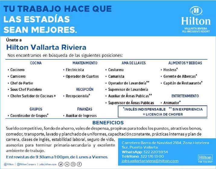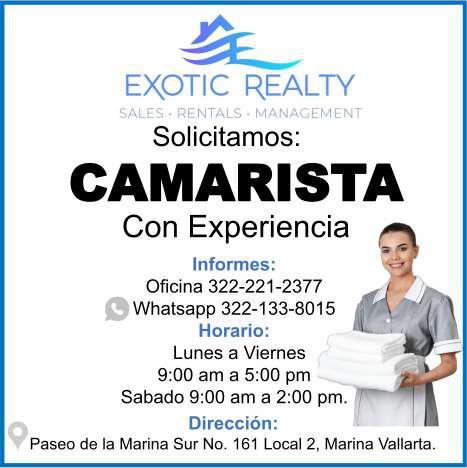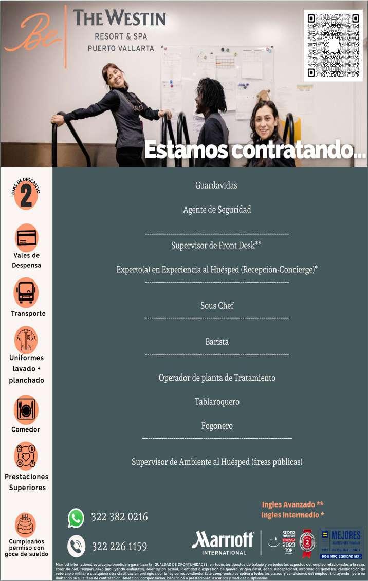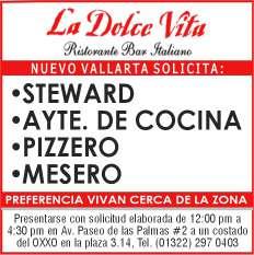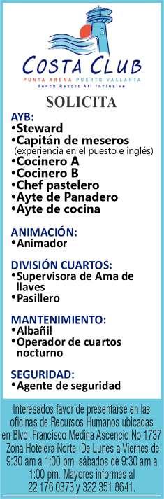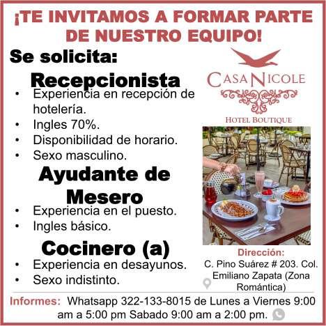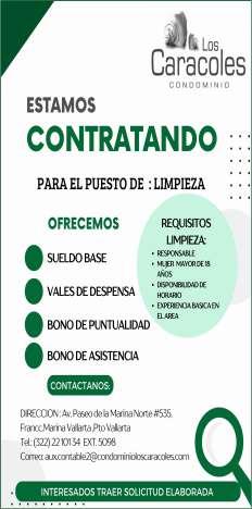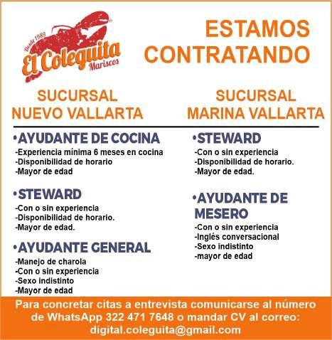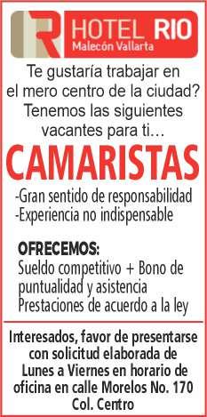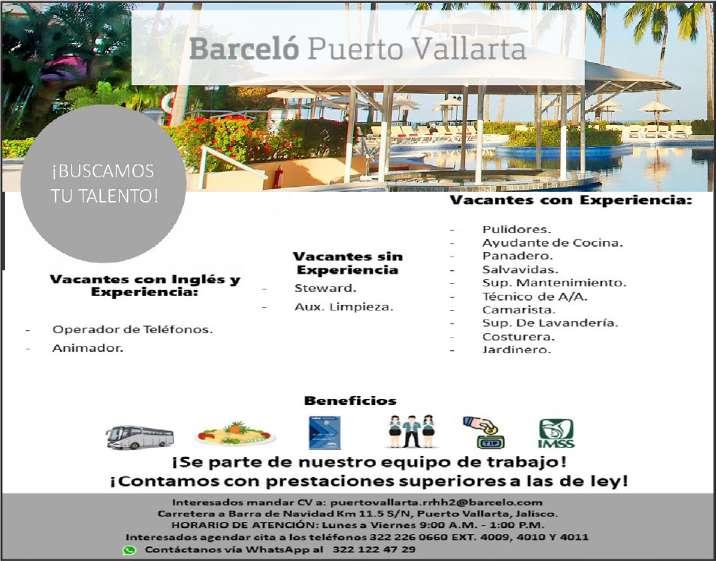 de horario. Área de Bucerías. Ofrecemos apoyo de transporte, salario quincenal, alimentos, uniformes. Inf. 331 00 834-13.+
