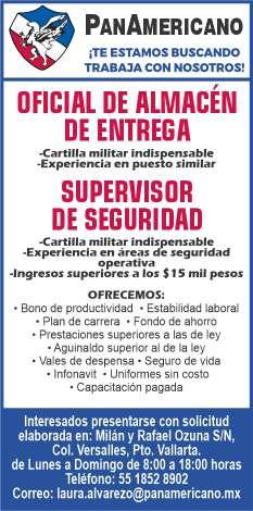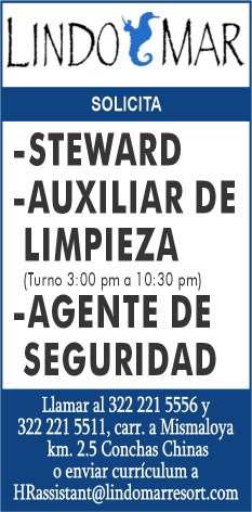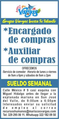 cia, área de Nuevo Vallarta, de 18 a 50 años, con experiencia, turno de 8 hrs., sueldo mensual $10,200 pesos. Informes. 322 29 710-46.+