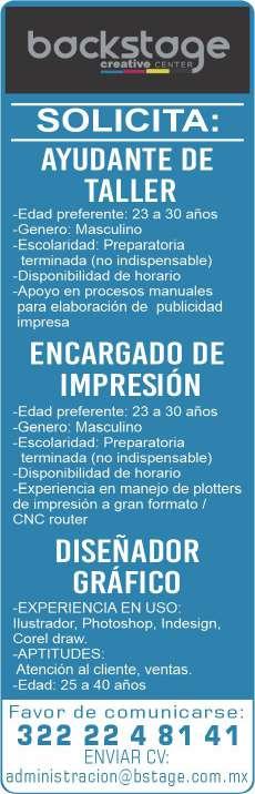 Estamos contratando encargado de impresión, de 23 a 30 años, sexo masculino, disponibilidad de horario. Inf. 322 22 481-41.+