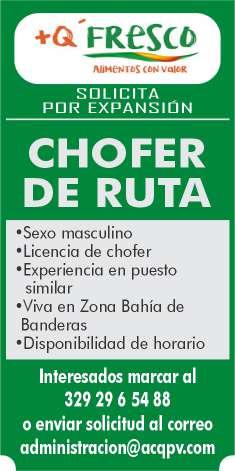 chofer de ruta, sexo masculino, licencia de chofer, experiencia en puesto similar, vivir en la zona Bahía de Banderas. Inf. 329 29 654-88.+
