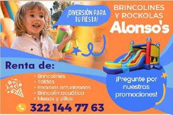 Brincolines y rockolas en renta, brincolines acuáticos, mobiliario, toldos, decoración con globos, taquizas, mantelería, toro mecánico. Informes. 322 13 623-61, 322 19 400-90.+