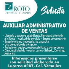 auxiliar administrativo de ventas, trabajo en equipo, atención al cliente, buena presentación, uso de equipo de cómputo. Interesados presentarse en calle Lucerna #107, col Versalles.