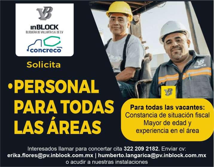 Importante bloquera te invita a formar parte de nuestro equipo, solicitamos personal para todas las áreas. Mayores de edad, experiencia en puesto a elegir, constancia de situación fiscal. Concertar cita. 322 20 921-82.+