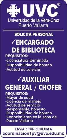 Se solicita auxiliar general/chofer, mayor de edad, licencia de manejo, responsable, honesto, disponibilidad de horario, conocimiento de la zona de Puerto Vallarta. Enviar cv a coodinacion1pv@uvc.edu.mx