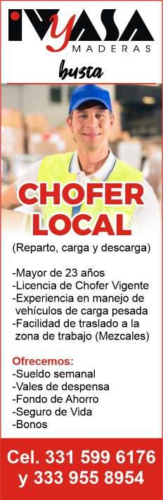 Se busca chofer local (reparto, carga y descarga), mayor de 23 años, licencia vigente de chofer, experiencia en manejo de carga pesada, ofrecemos sueldo semanal, vales de despensa, bonos, seguro de vida. Inf. 331 59 961-76, 333 95 589-54.+