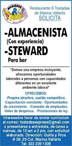 cia en el puesto, disponibilidad de horario. Área de Bucerías. Ofrecemos apoyo de transporte, salario quincenal, alimentos, uniformes. Inf. 331 00 834-13.+