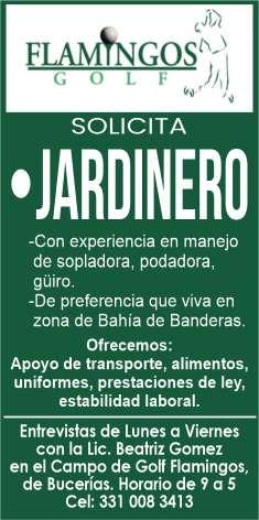 Solicitamos jardinero, experiencia en manejo de podadora. Área de Bucerías. Ofrecemos apoyo de transporte, salario