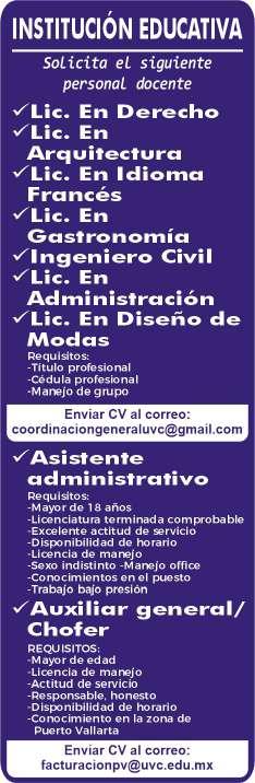Se solicita auxiliar general/chofer, mayor de edad, licencia de manejo, responsable, honesto, disponibilidad de horario, conocimiento de la zona de Puerto Vallarta. Enviar cv a coodinacion1pv@uvc.edu.mx