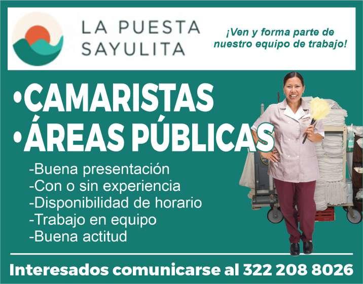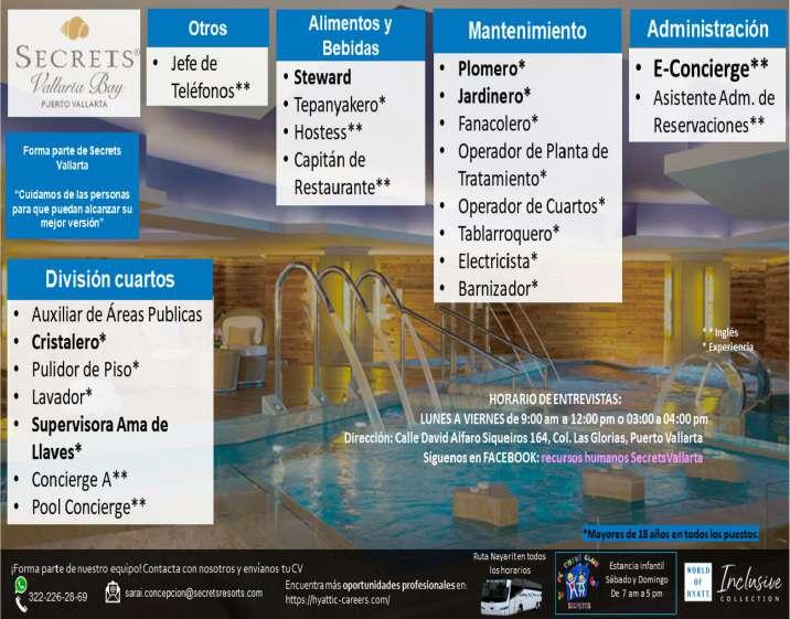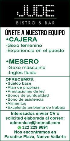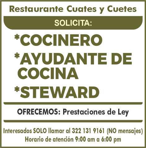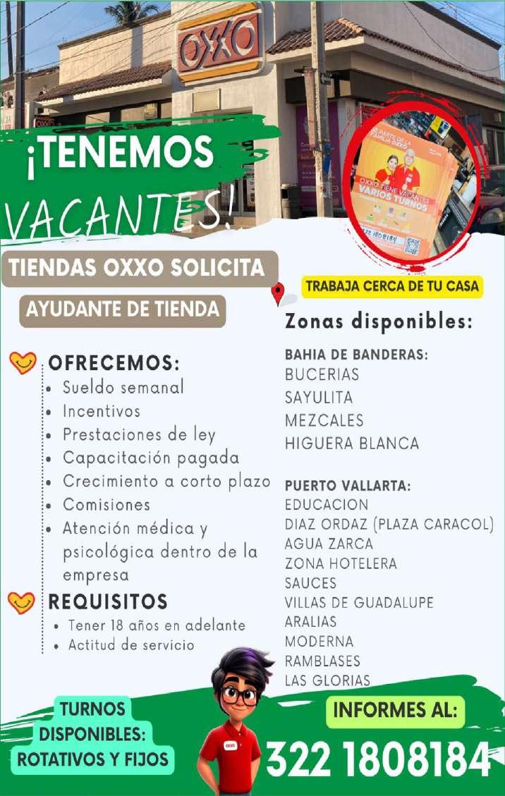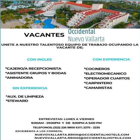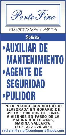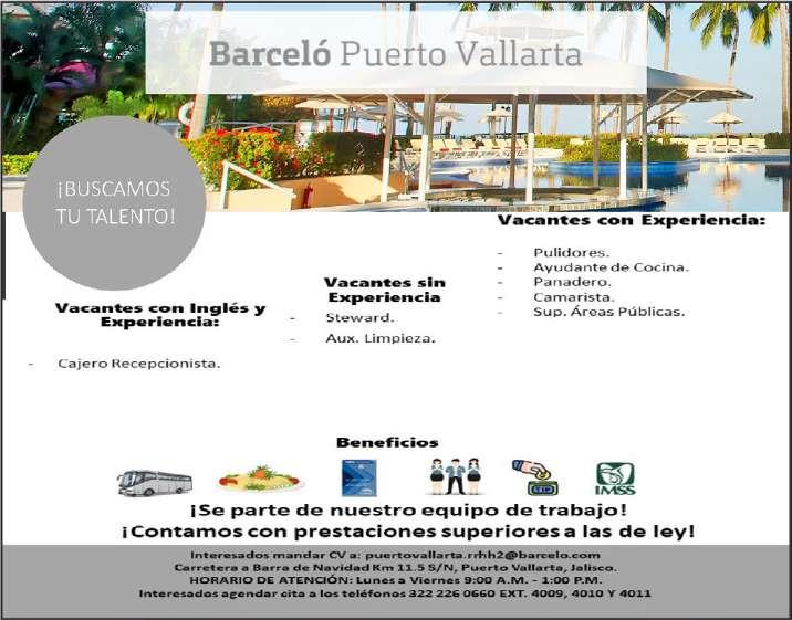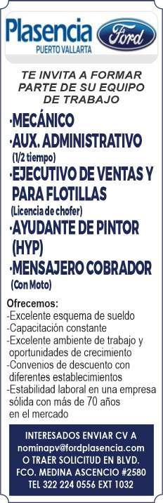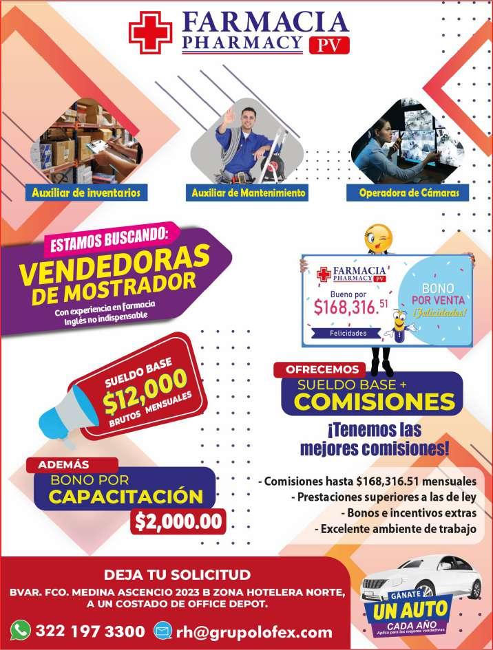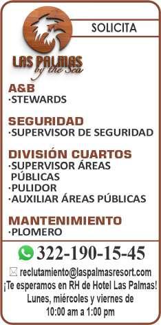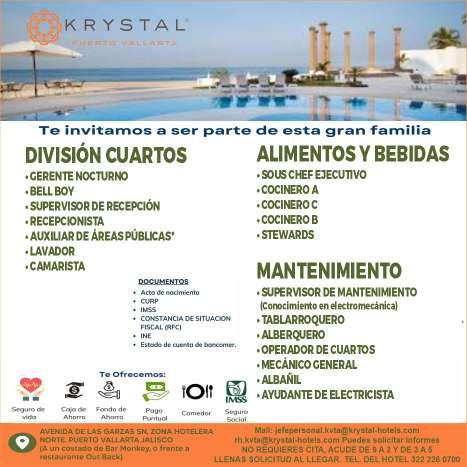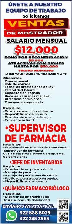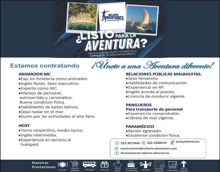 Vallarta y Bahía de Banderas, ofrecemos sueldo base $2,000, prestaciones de ley. Inf. 322 13