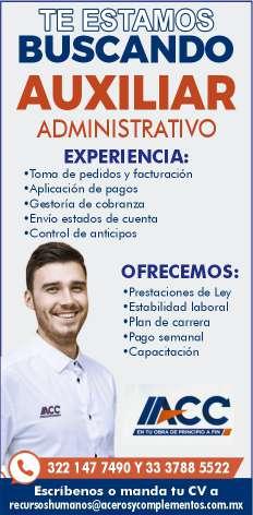 Se busca auxiliar de almacén, mayor de 23 años, facilidad de traslado a Mezcales. Ofrecemos sueldo semanal, vales de despensa, bonos, seguro de vida. Inf. 331 59 961-76, 333 95