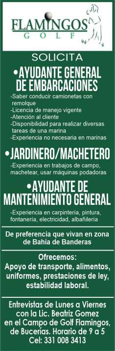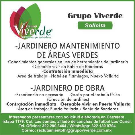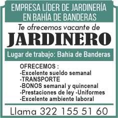 Solicitamos jardinero, experiencia en manejo de podadora, ayudante de mantenimiento general, experiencia en pintura, fontanería, electricidad. Área de Bucerías. Ofrecemos apoyo de transporte, salario quincenal, alimentos, uniformes. Inf. 331 00 834-13.+