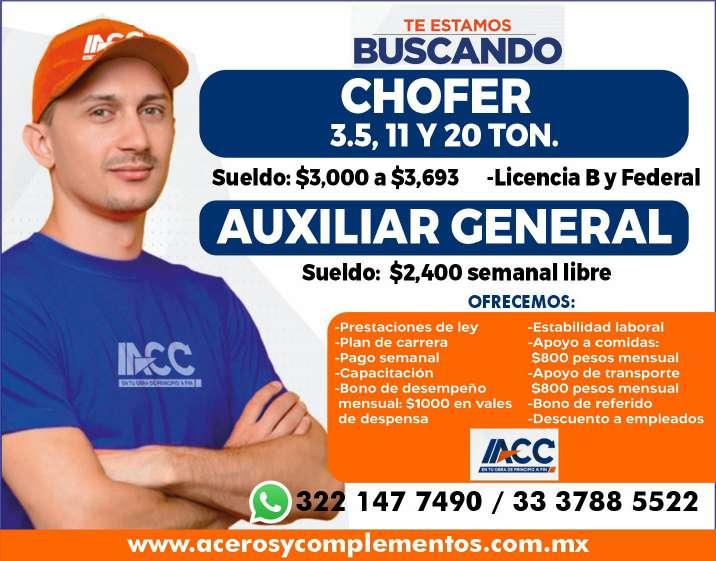 cencia de chofer vigente, experiencia mínima 1 año en puesto similar. Ofrecemos excelente sueldo, prestaciones de ley. Inf. Calle Los Pinos #109, Col. Los Sauces. Tel. 331 89 531-04.+
