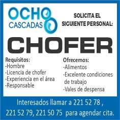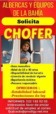 cencia de chofer vigente, experiencia mínima 1 año en puesto similar. Ofrecemos excelente sueldo, prestaciones de ley. Inf.