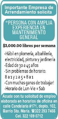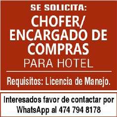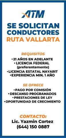 tores, licencia estatal Nayarit, 1 año de experiencia, 21 años en adelante. Inf. 644 15 008-87.+