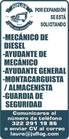 18 a 50 años, con experiencia, turno de 8 hrs., sueldo quincenal $4,200 pesos. Informes. 3222971046 .+