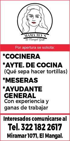 mayor de 23 años, facilidad de traslado a Mezcales. Ofrecemos sueldo semanal, vales de despensa, bonos, seguro de vida. Inf. 331 59 961-76, 333 95 589-54.+