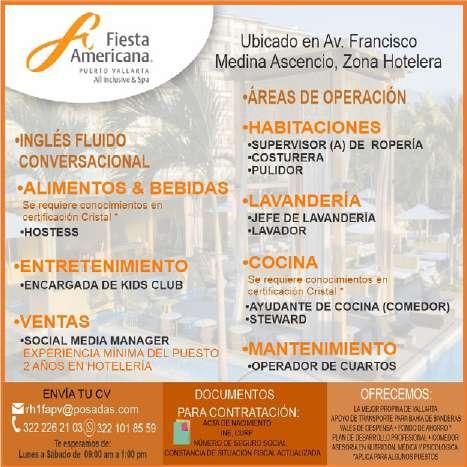 disponibilidad de horario, conocimiento de la zona de Puerto Vallarta. Enviar cv a factura-