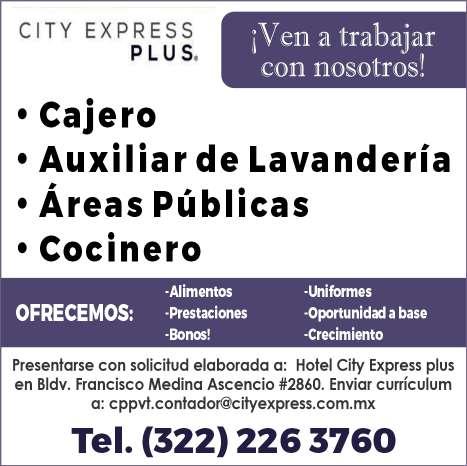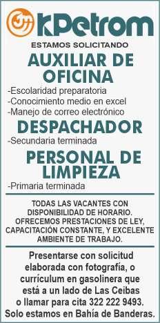 Vallarta y Bahía de Banderas, ofrecemos sueldo base $2,000, prestaciones de ley. Inf. 322 13 492-76.+