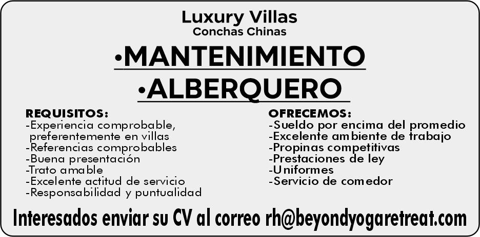 Solicitamos jardinero, experiencia en manejo de podadora, ayudante de mantenimiento general experiencia en pintura, fontanería, electricidad. Área de Bucerías. Ofrecemos apoyo de transporte, salario quincenal, alimentos, uniformes. Inf. 331 00 834-13.+