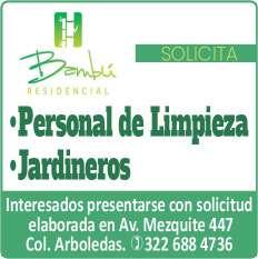 personal de limpieza, disponibilidad de horario, ganas de trabajar, actitud servicial. Inf. de lunes a viernes. 322 22 676-81, ext . 50-2 .+