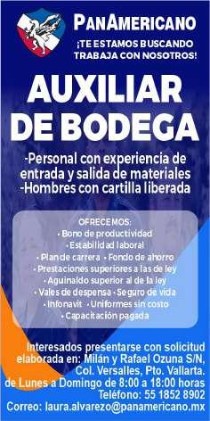 Se busca auxiliar de almacén, mayor de 20 años, facilidad de traslado a Mezcales. Ofrecemos sueldo semanal, vales de despensa, bonos, seguro de
