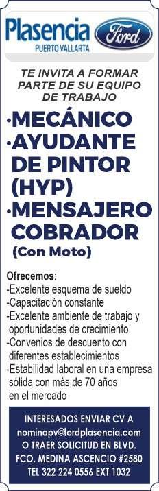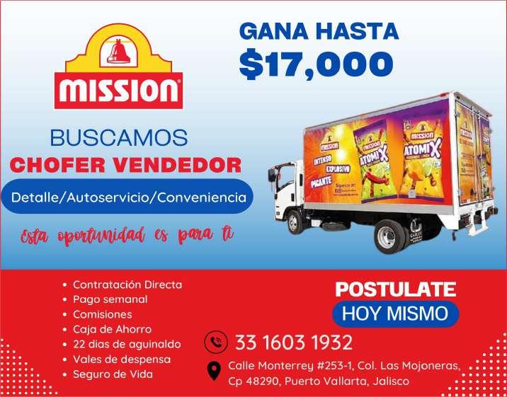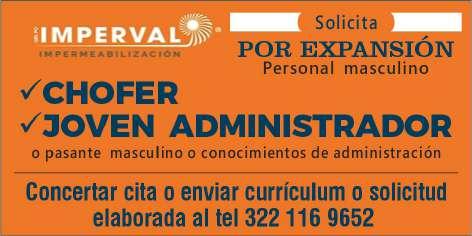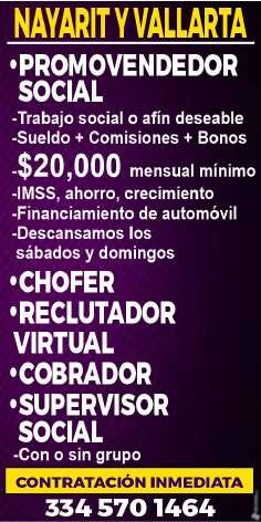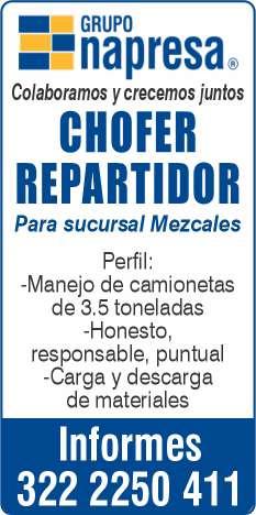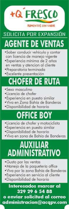 Únete a nuestro equipo como chofer/cobrador, sexo masculino, licencia de chofer y motociclista, experiencia en puesto similar, vivir en la zona Bahía de Banderas. Inf. 329 29 654-88.+