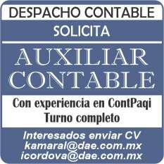 Despacho contable solicita auxiliar contable, turno completo. Interesados enviar cv: kamaral@dae.com.mx, icordova@ dae.com.mx