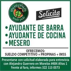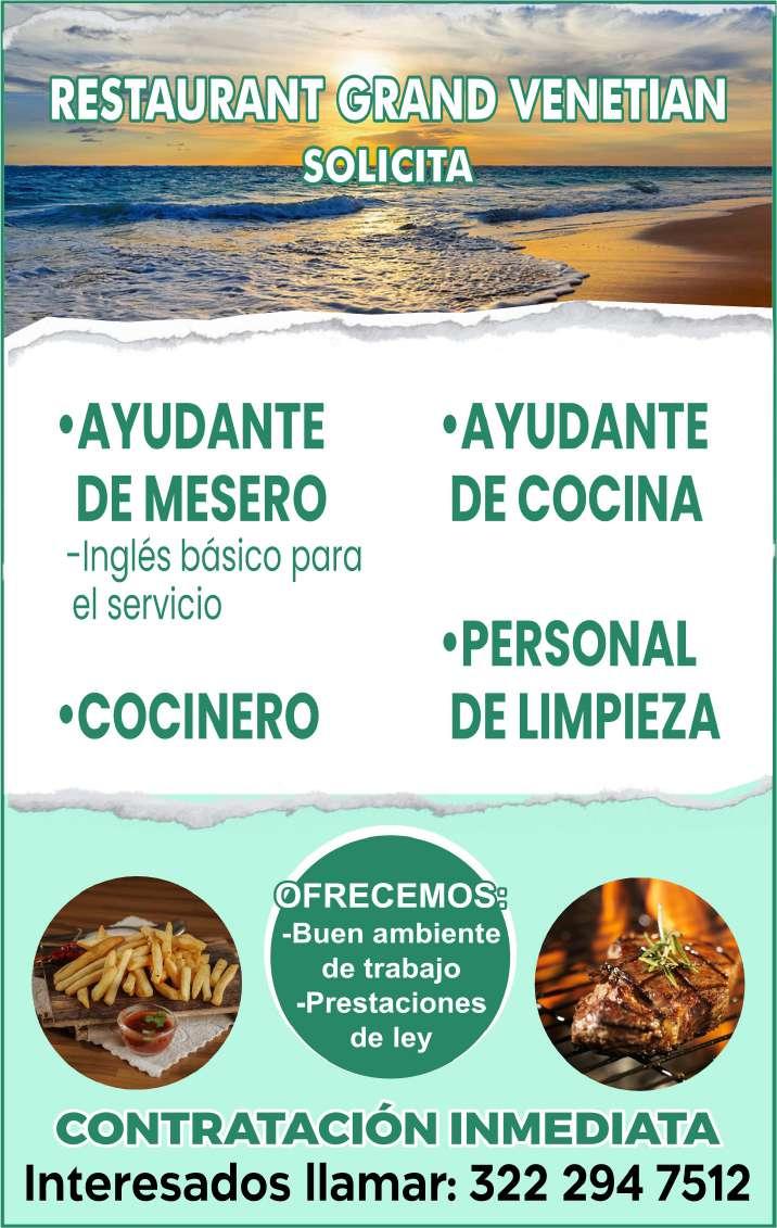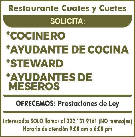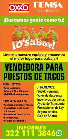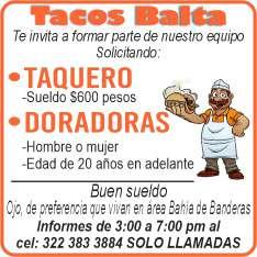 Solicitamos personal para puesto de tacos. Ofrecemos vales de despensa, uniformes, caja de ahorro, prestaciones de ley. Inf. 322 11 138-46.+