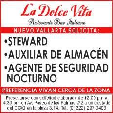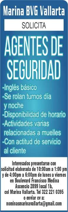 bajo, solicitamos agentes de seguridad, inglés básico, experiencia en el puesto, disponibilidad de horario. Inf. 322 22 103-95.+