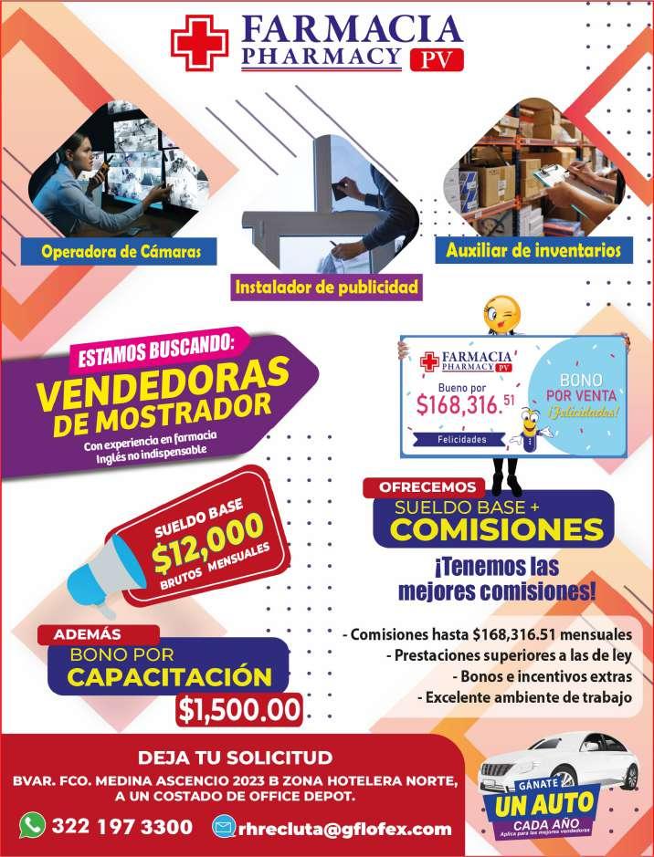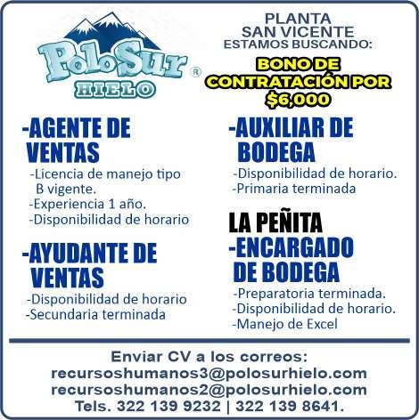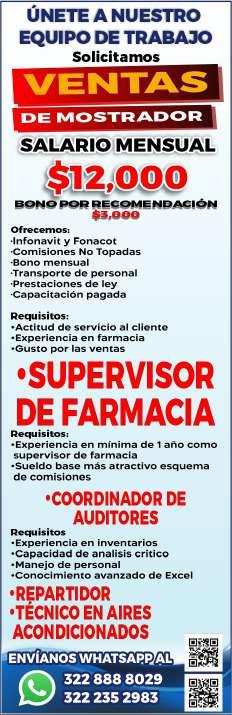 Se solicita personal ventas de mostrador, gusto por la atención al cliente, disponibilidad de horario. Ofrecemos pago semanal, vale de comida, prestaciones de ley. Envíanos WhatsApp al. 322 88 880-29, 322 23 52983.+
