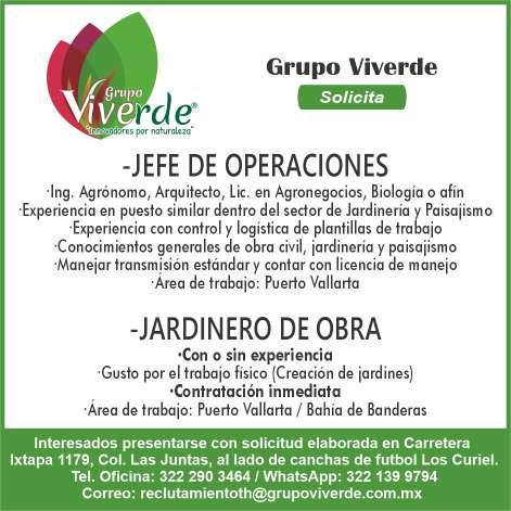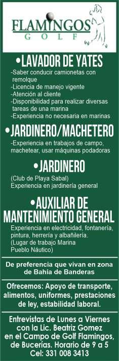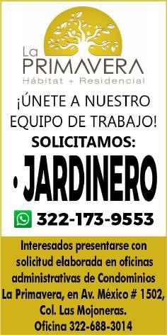 Solicitamos jardinero, experiencia en manejo de podadora. Ofrecemos apoyo de transporte, salario quincenal, alimentos, uniformes. Inf. 331 00 834-13.+