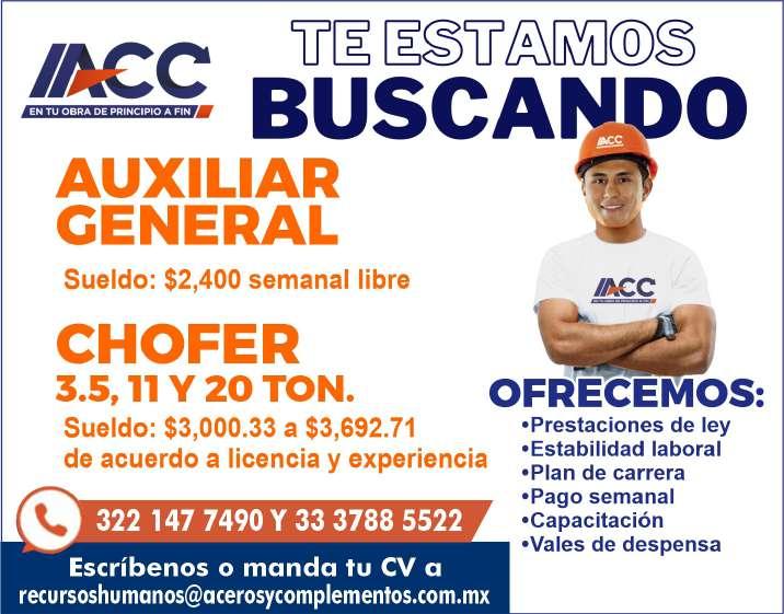 Estamos contratando Chofer, licencia de chofer vigente, experiencia mínima 1 año en puesto similar. Ofrecemos ex-