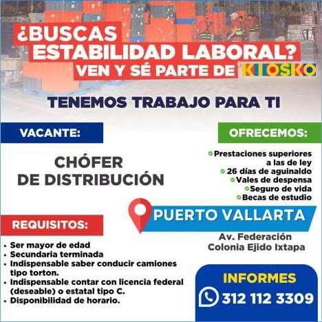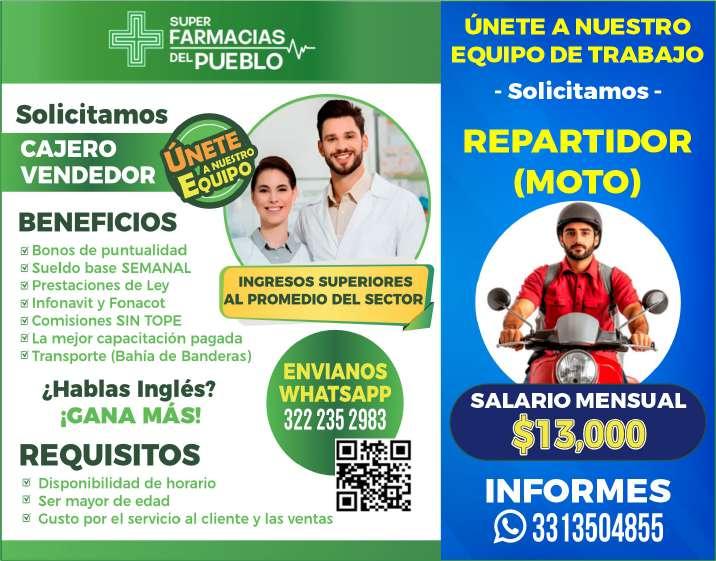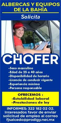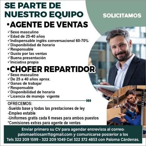 Únete a nuestro equipo, solicitamos chofer vendedor, vendedora de mostrador. Ofrecemos sueldo base, prestaciones de ley. Inf. 322 22 463-61, 322 22 497-10.+